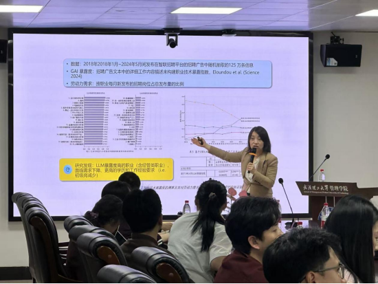 讲座中,迟教授围绕人工智能发展引发的职业变革作深入解读。她指出,AI技术深刻重塑工作任务结构,推动传统工作模式向人机协作转型,对岗位技能、人力资本配置及薪酬体系提出新要求。结合招聘大数据,她讲解了岗位技能画像构建方法,分析企业技能需求变化以及对员工薪酬的影响,系统揭示生成式AI对人力资本回报结构的作用机制。