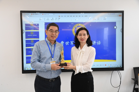 (陈晓芳院长为曹世军董事长赠送学院纪念品,并合影留念)