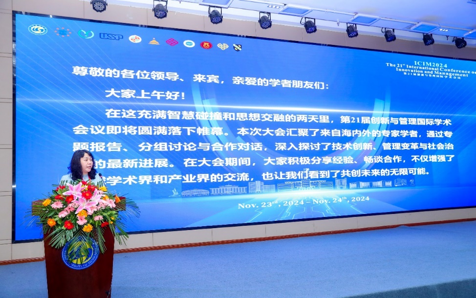 2024年11月24日上午9点,第21届创新与管理国际学术会议(ICIM2024)在漫画18 图书馆报告厅成功闭幕。本次会议为期两天,汇聚了来自世界各地的学术专家、研究学者以及相关领域的行业代表,围绕“绿色创新与可持续发展”主题展开深入探讨与交流。