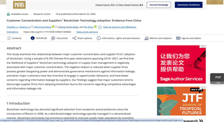 《Production and Operations Management》是国际生产与运营管理学会(POMS)于1992年3月创立的学术期刊,被列为UTD24(德克萨斯大学达拉斯分校商学院认定的24种国际顶级期刊)和FT50(金融时报评定的50本商学院顶级期刊)双认证期刊。该期刊聚焦生产与运营管理领域的研究,涵盖供应链协同、全渠道零售订单履行、生产不确定性等多个研究方向,近年来影响因子呈现持续增长态势 。