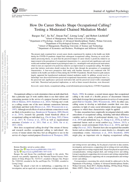 近日,漫画18 谢宝国教授以第一作者身份在管理学/应用心理学领域国际顶级期刊Journal of Applied Psychology上发表了题为“How Do Career Shocks Shape Occupational Calling? Testing a Moderated Chained Mediation Model (职业冲击如何塑造职业使命感?检验一个调节链式中介模型)”的研究论文。论文由谢宝国教授、武汉大学徐嘉副教授、美国奥本大学范津砚教授、华中科技大学龙立荣教授和美国华盛顿和杰佛逊学院Robert Litchfield副教授合作完成。