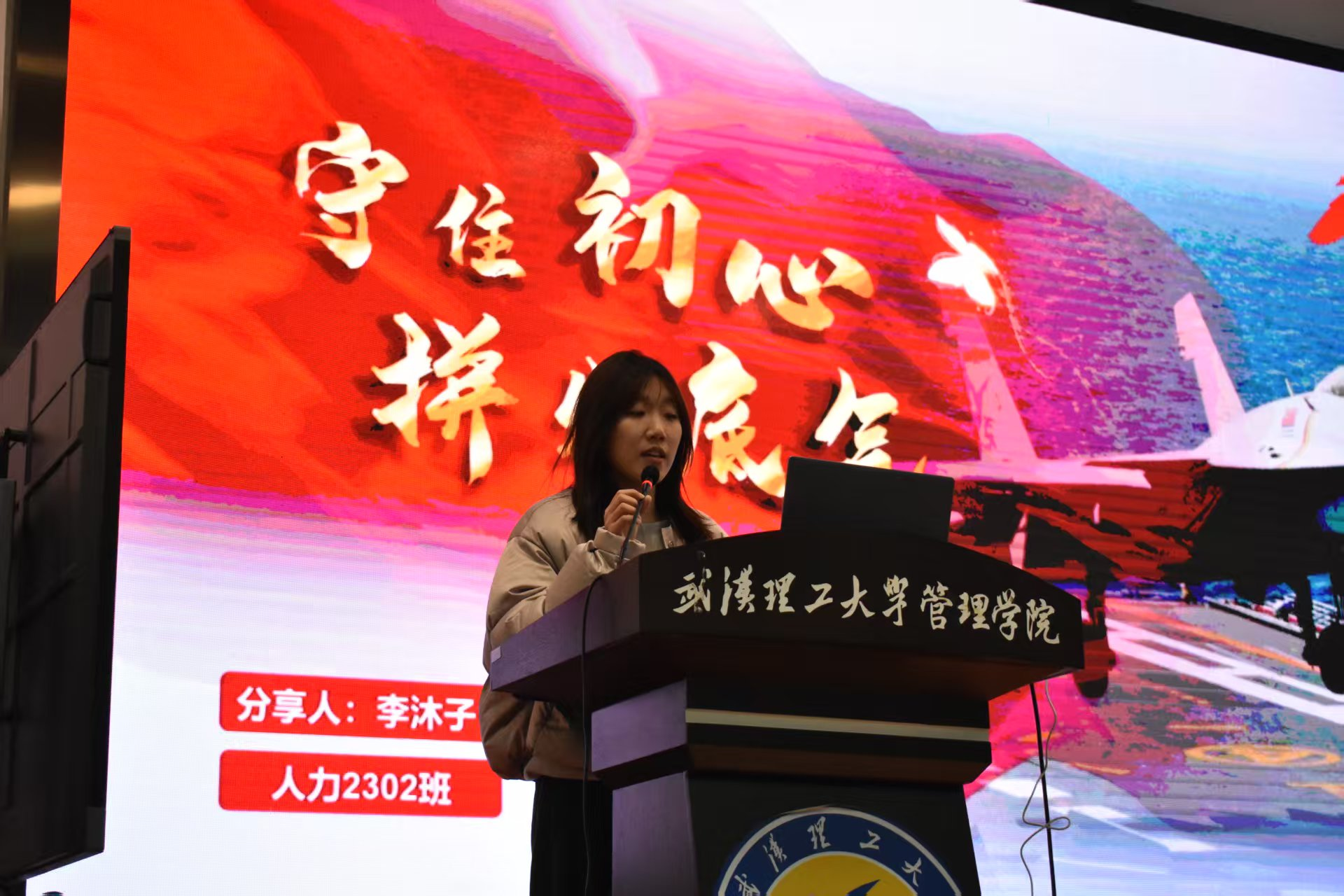 李沐子同学以《守住初心,拼搏底气》为主题讲述了自己从入伍南海舰队到退役复学的经历,从新兵训练的咬牙坚持、通讯兵岗位的责任认知到复学后重拾状态的过程鼓励同学们在不同赛道上勇敢追寻价值、实现自我突破。