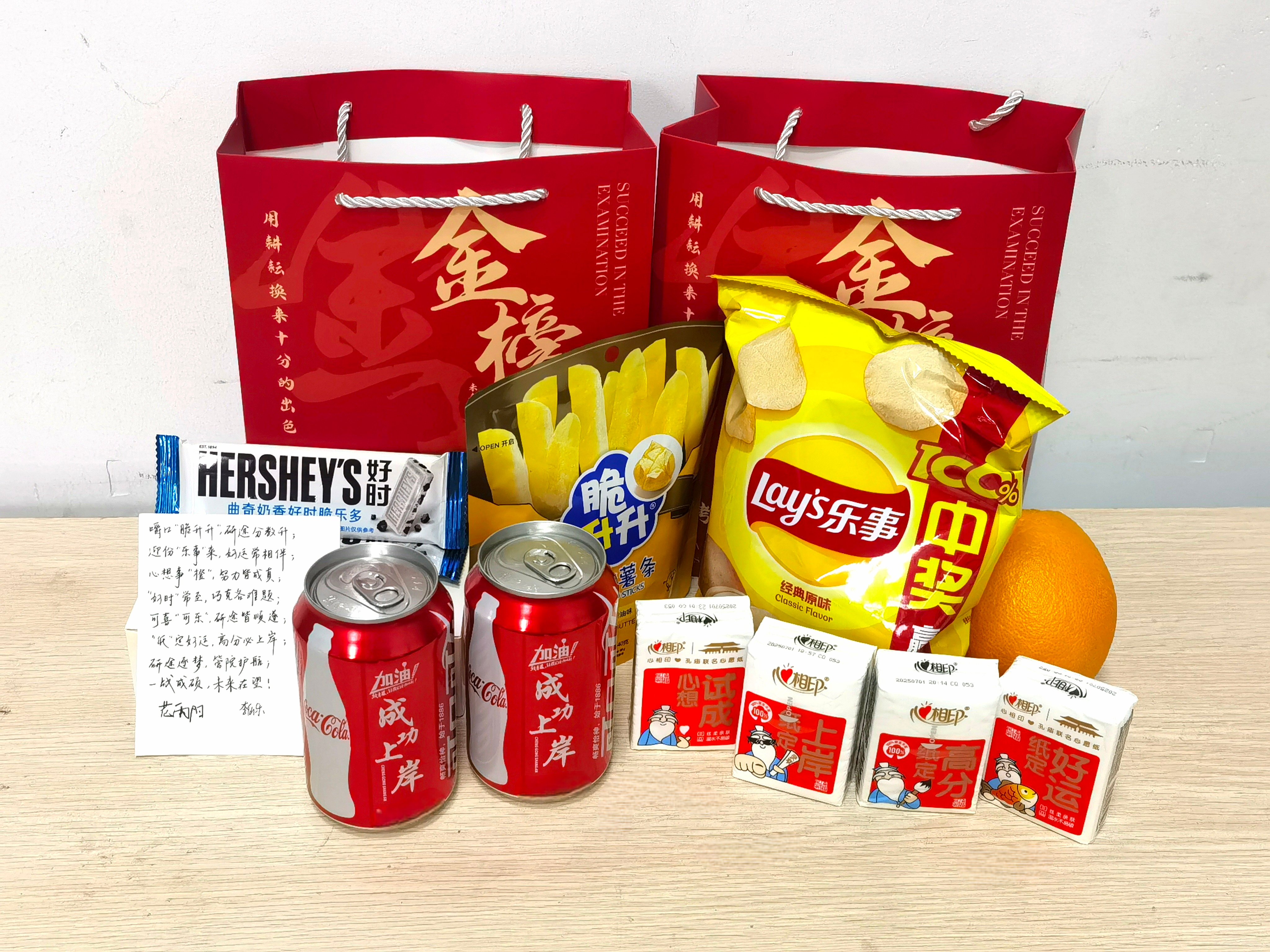 活动前期,学院充分结合考研学子冲刺阶段的身心需求,精心挑选六样暗藏美好祝福的物资组成考研暖心礼包,数字“六”更寄托着“六六大顺”的吉祥寓意。礼包里既有橙子、乐事薯片、脆升升、好时巧克力、纸巾、专属定制可乐这些满载巧思的好物,还贴心搭配了暖心祝福卡片,每一张卡片都承载着学院对学子的殷切期许,字里行间满是鼓励与牵挂,让这份礼包既有抚慰备考疲惫的“实用感”,更有满载师生关怀的“归属感”。