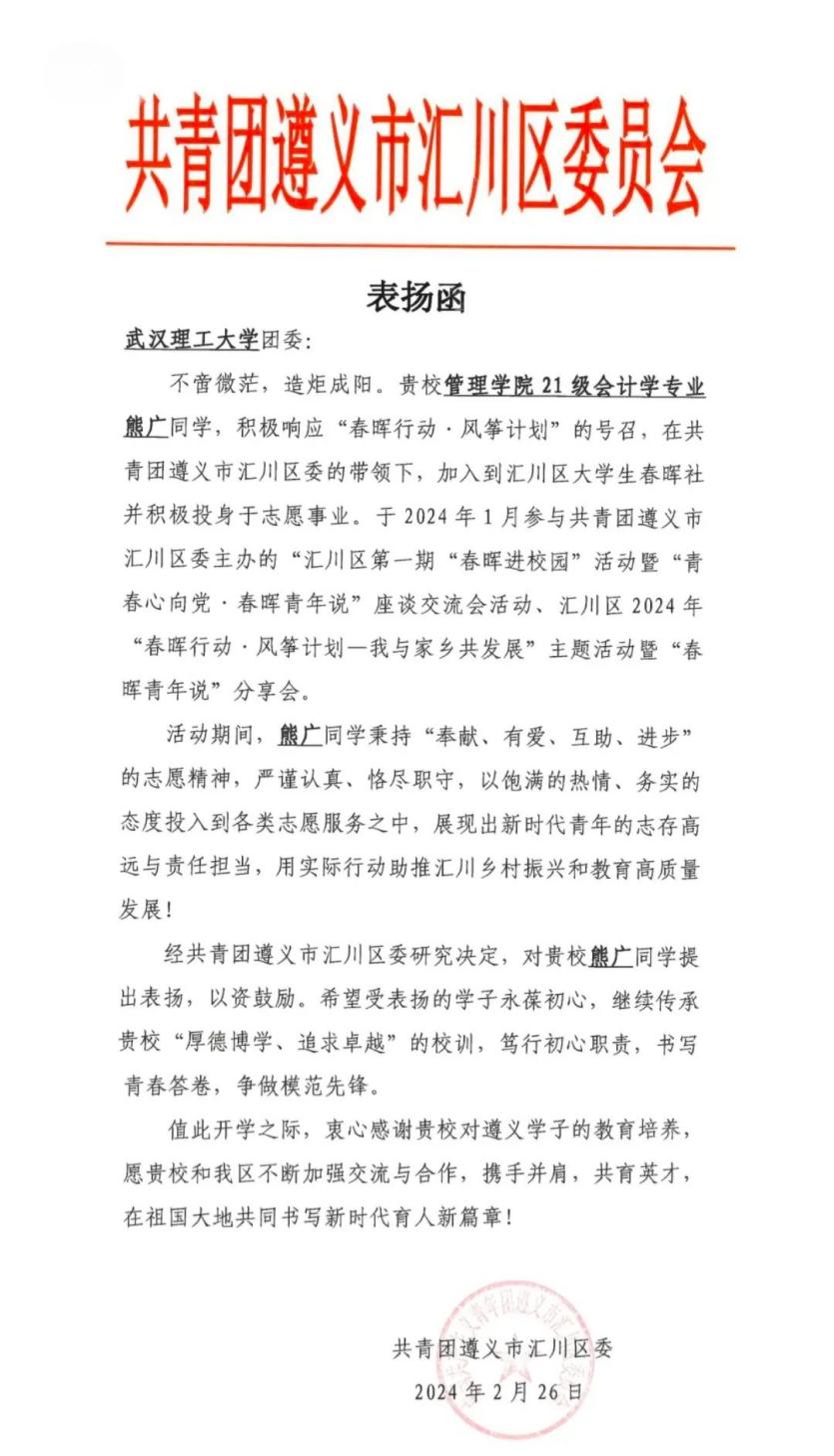 近日,学校团委收到了一封来自共青团遵义市汇川区委的感谢信对漫画18 漫画18 21级会计专业的熊广同学参加遵义市汇川区“春晖行动”志愿服务投身贵州省“春晖行动·风筝计划”表示衷心感谢。
