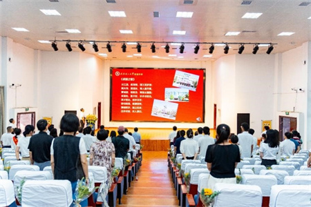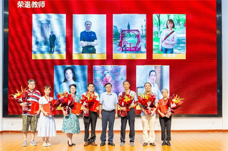 离退休工作部(处)唐昌飞部(处)长为到会的荣休教师代表颁发荣休证书和荣休纪念章,学生代表向荣休教师献花。